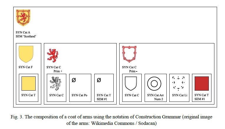 Heraldiska vapen har, trots att de inte är en del av det lingvistiska systemet, en tydlig struktur som ger det ett, fragmentariskt, semantiskt uttryck eller innehåll. Precis som vanliga namn.